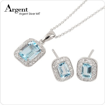 【ARGENT銀飾】晶鑽系列「簡約寶鑽(天藍色)(白K金)」 純銀項鍊+耳環(套組)