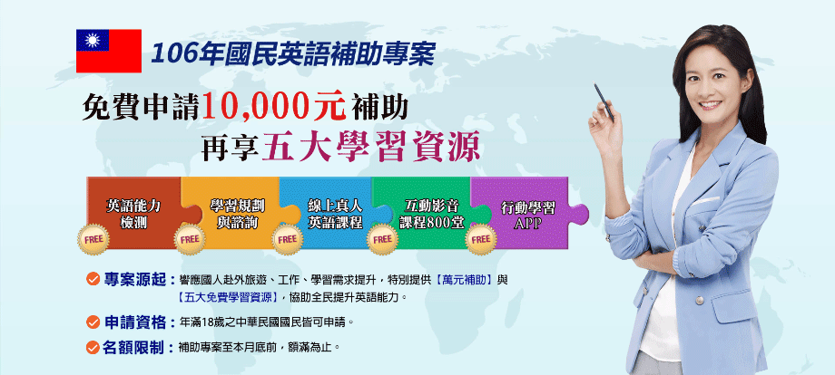 【106年國民英語補助專案】免費申請補助,再享五大學習資源